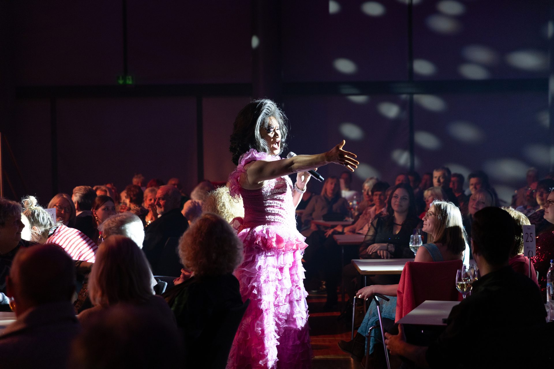Wenn diese dann im k1 eintreffen, verdichtet sich all das, was vorher abstrakt war. Make-up wird aufgetragen, Kostüme werden zurechtgezupft, erste Nervosität mischt sich mit Vorfreude. Währenddessen wartet auf sie ein dichtes Programm: Teambesprechung und kurze Check-ins mit Technik und Abenddienst. Die k1-Leiterin gibt klare Anweisungen, entscheidet Details, glättet Unvorhergesehenes und freut sich mit verschmitztem Lächeln, dass dem Einlass-Team aufgefallen ist, dass noch Tischdeko fehlt: „Stand nicht in der Checkliste, ich habe es übersehen“, grinst und kann den Moment kaum erwarten, wenn der Vorhang aufgeht.