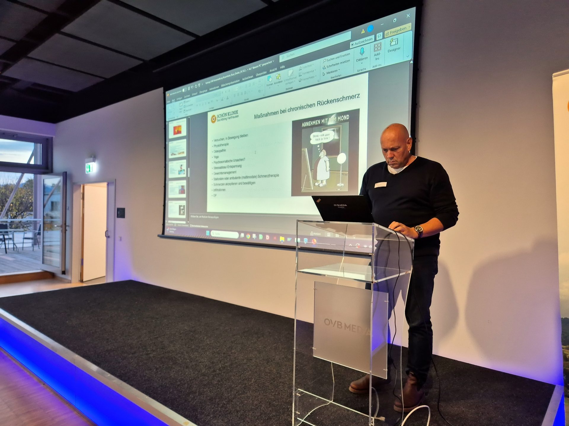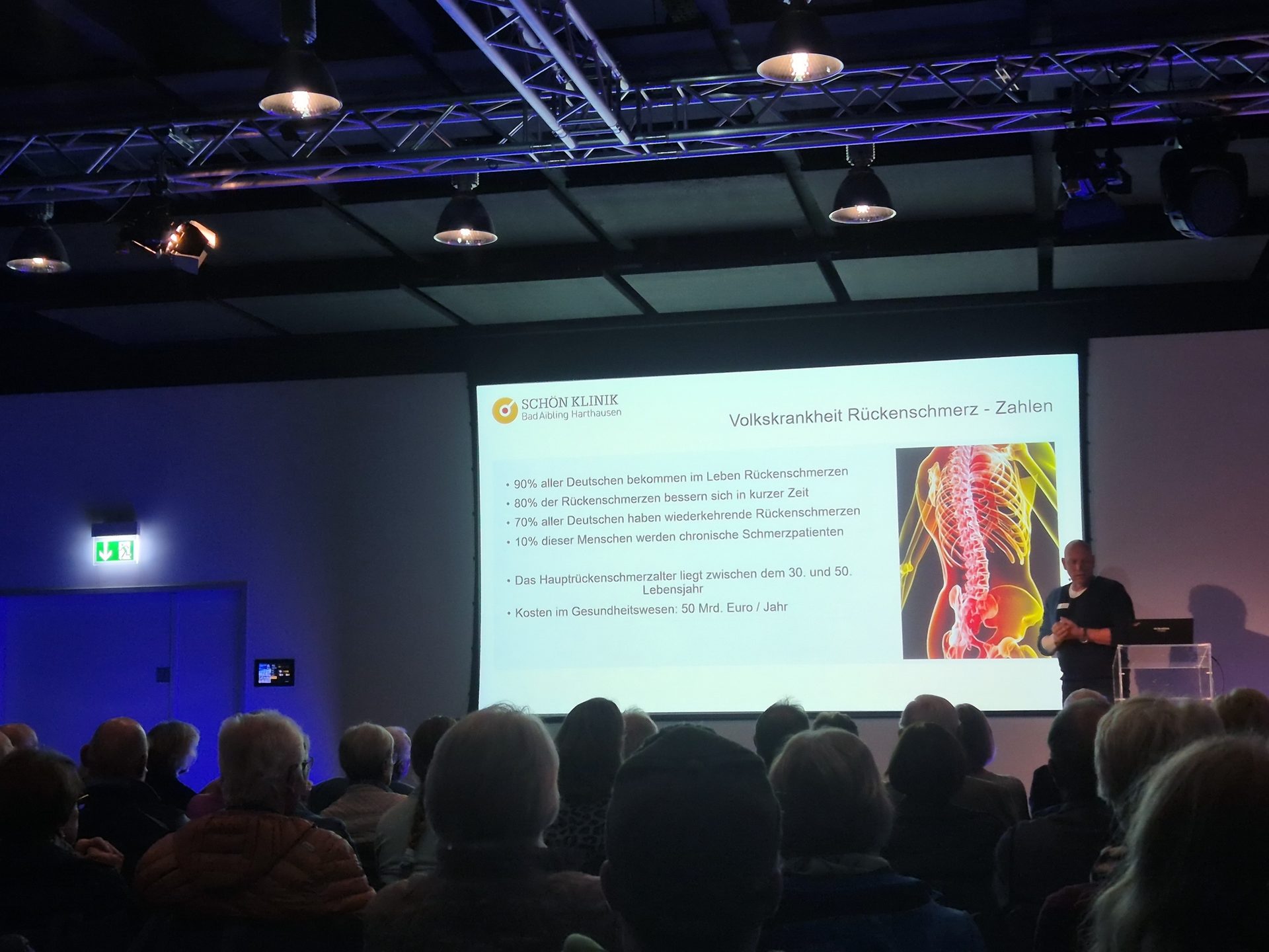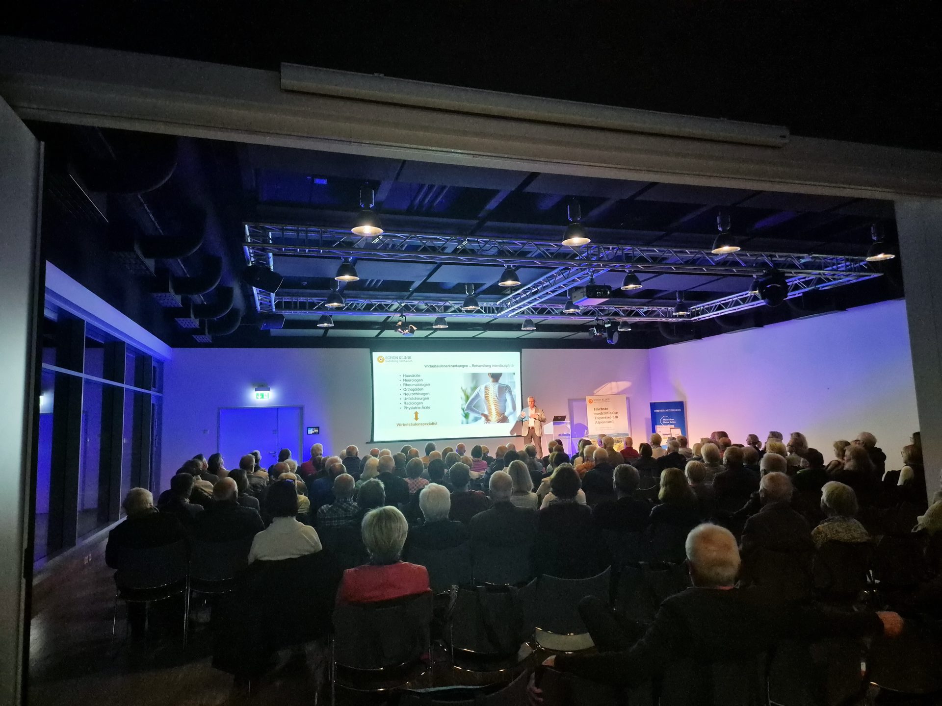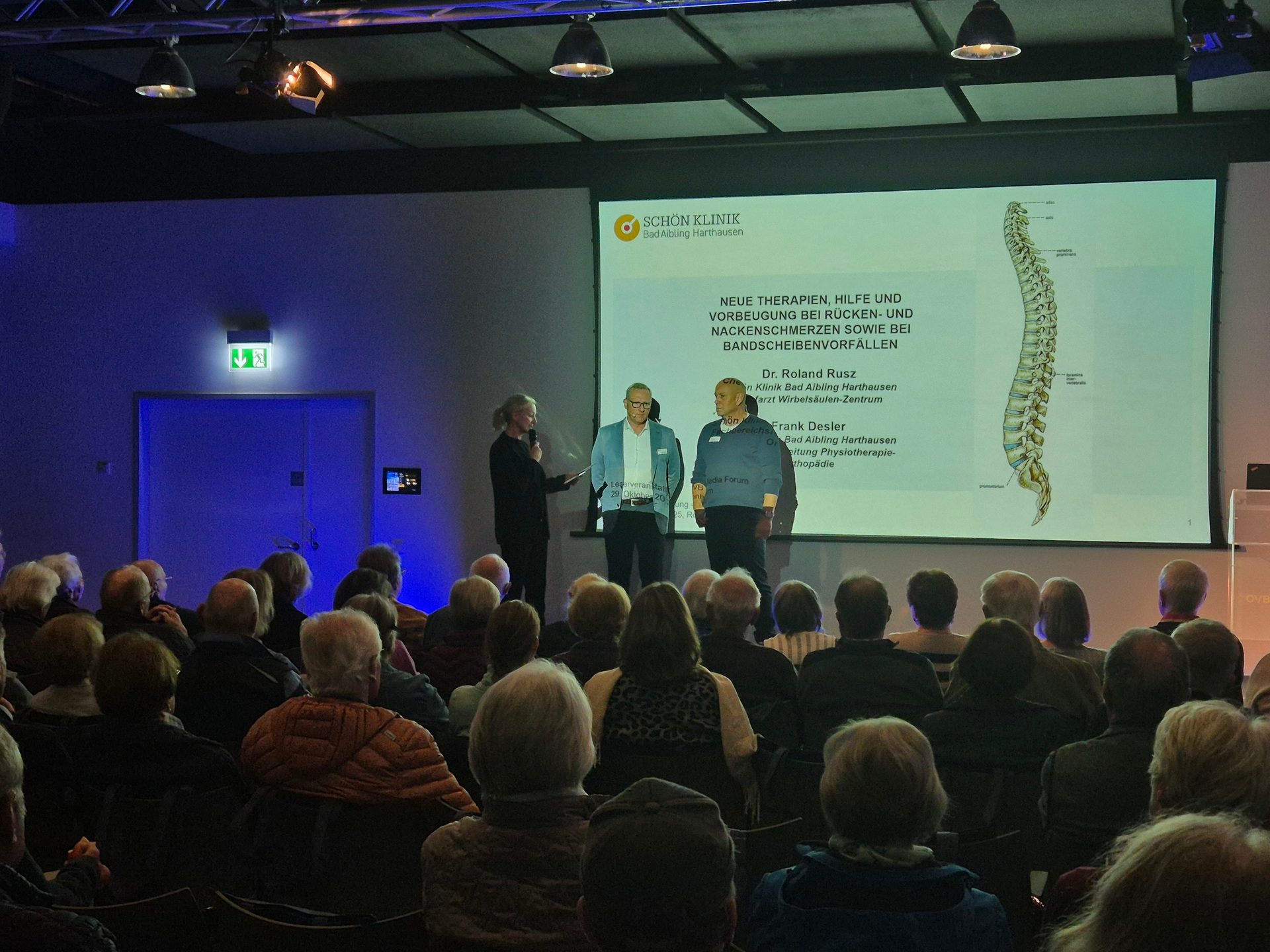 Diese Begeisterung teilte er nun mit einem großen Publikum: Mehr als 120 Besucherinnen und Besucher kamen zur ersten gemeinsamen Patientenveranstaltung von Schön Klinik und OVB Heimatzeitungen ins OVB MEDIA Forum in Rosenheim. Dort informierten Dr. Rusz und sein Kollege Frank Desler, Physiotherapeut in der Schön Klinik Bad Aibling, über Ursachen, Behandlungswege und Vorbeugung bei Rücken- und Nackenschmerzen.